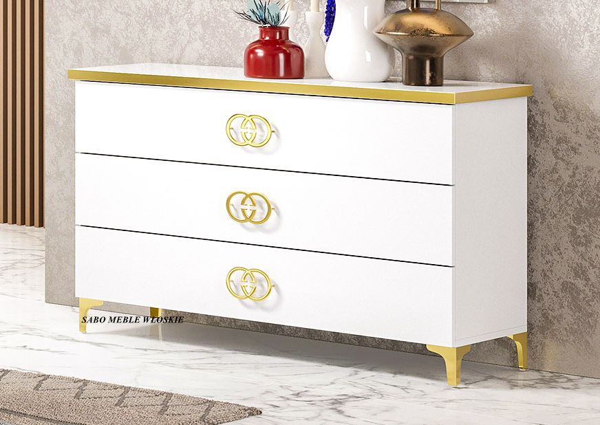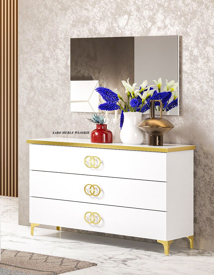 białym ,ozdobiona złotymi dodatkami.Nóżki i uchwyty metalowe,szuflady zaopatrzone
