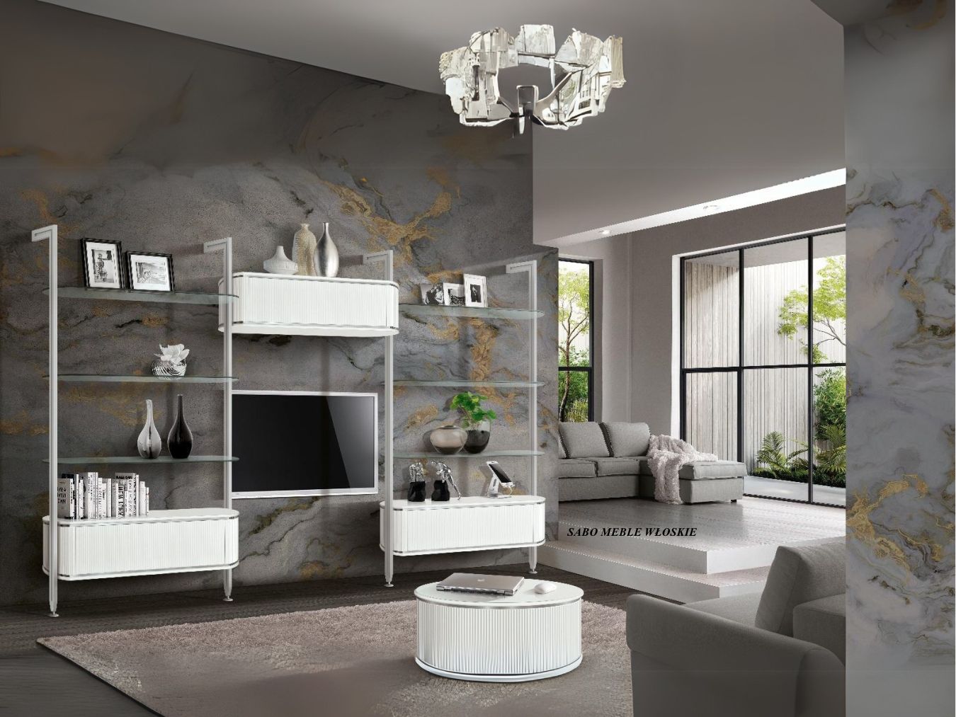 kryształkiem Swarovskiego we frontach witryn.Szuflady i drzwi komód,stolików tv ,konsoli