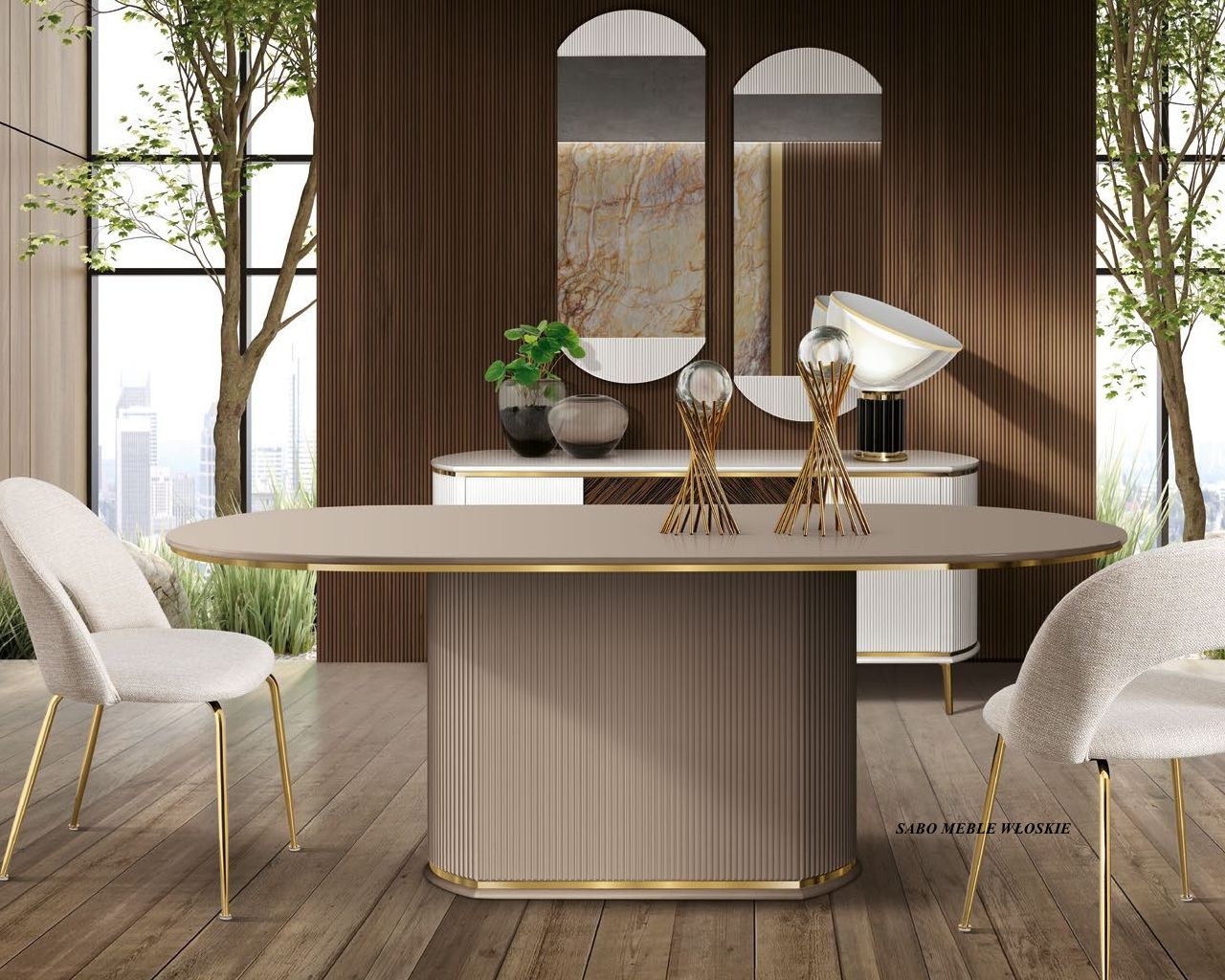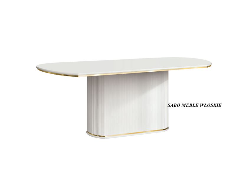 Stół owalny Margaret nierozkładany ,ozdobiony listwami w kolorze złotymMEBLE SĄ ZAMAWIANE I PRZYWOŻONE TYLKO I WYŁĄCZNIE NA KONKRETNE ZAMÓWIENIE KLIENTA