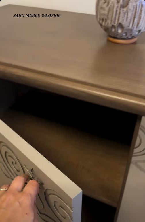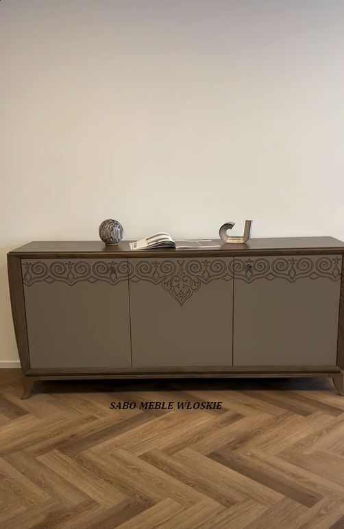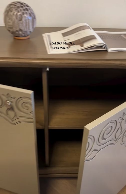 Włoski styl i kunszt wykonania zawarte są w specyfice rzeźby na przodzie drzwi kredensu