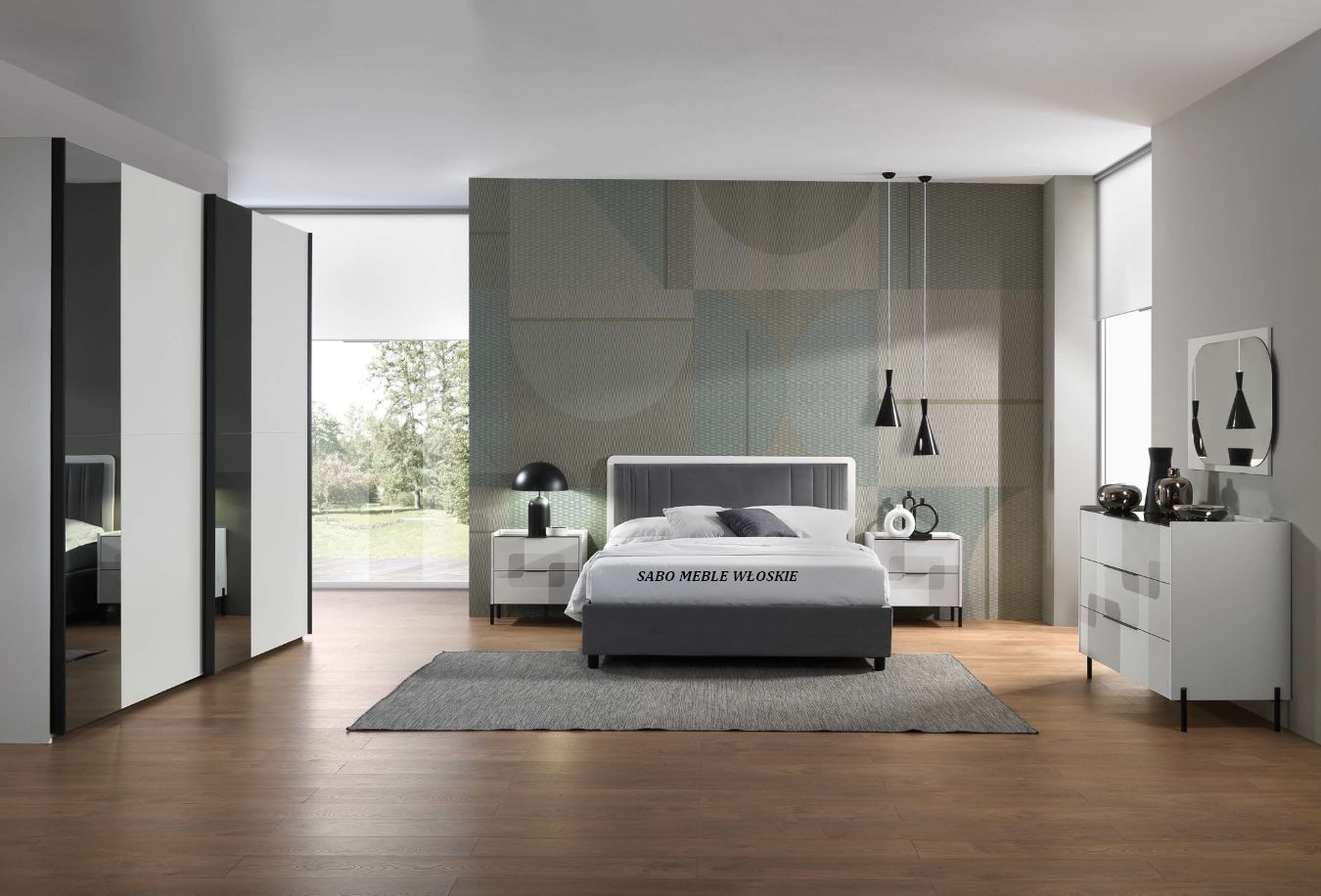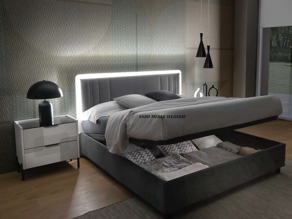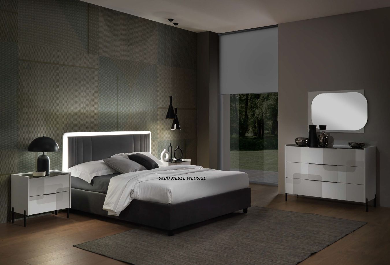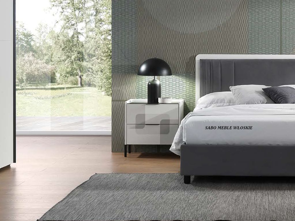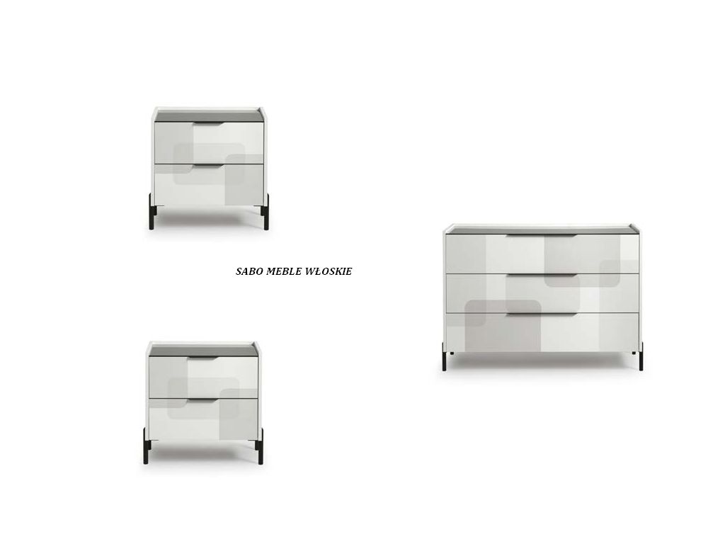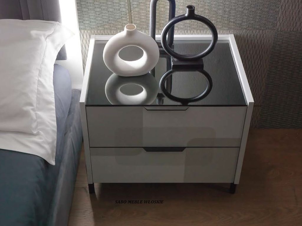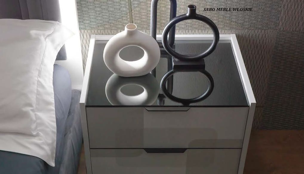 Komody i szafki nocne posiadają blat lustrzany przyciemniony a szuflady wyposażone są