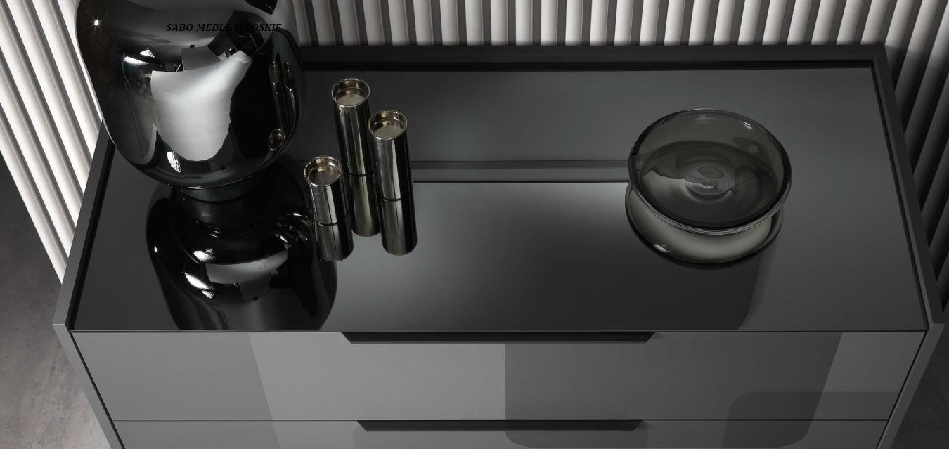 Matowe uchwyty aluminiowe wzdłuż krawędzi szuflad dopełniają elegancję kolekcji.