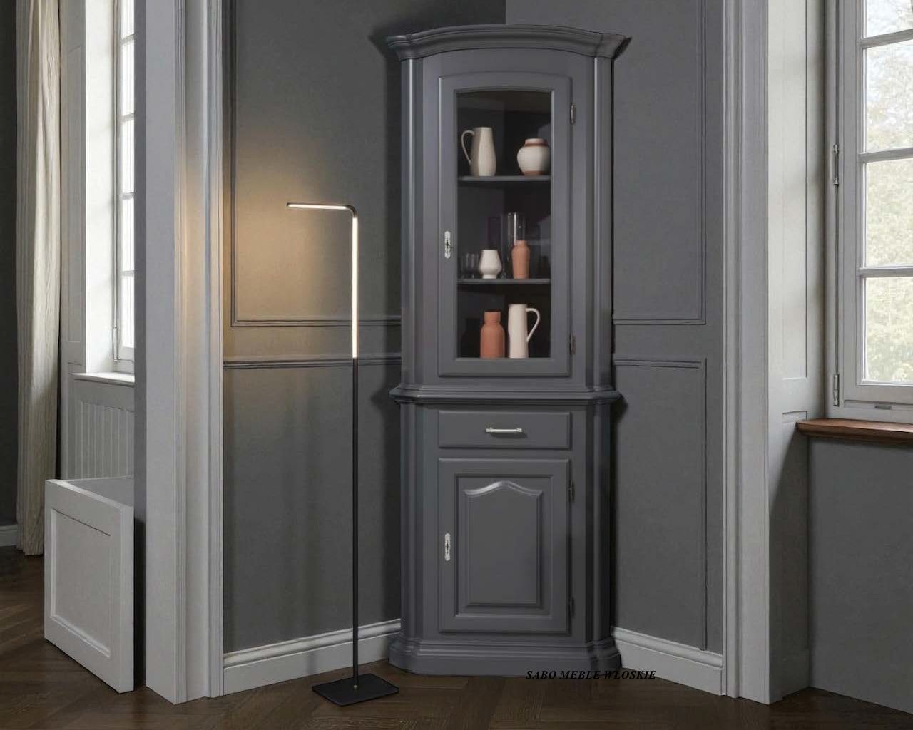 witryna narożna Linosa ,wykonana z drewna orzechowego do wybarwienia