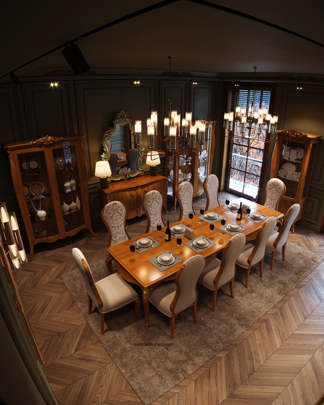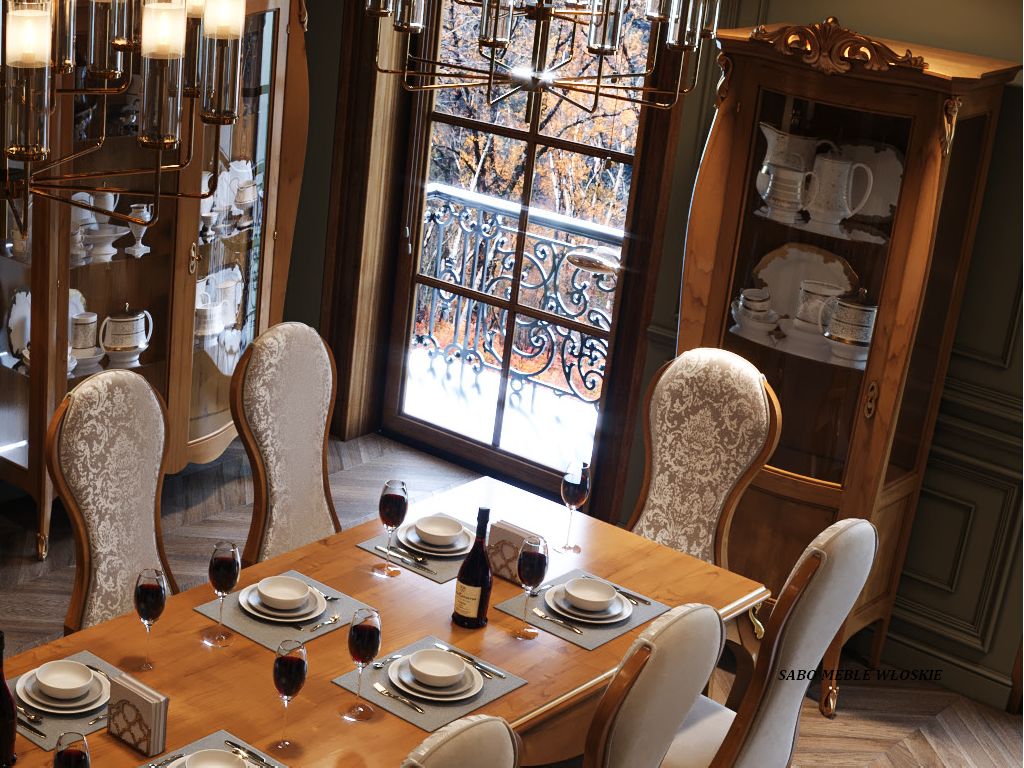 z ekscentrycznym rozmachem.Meble pokryte fornirem orzechowym wybarwione