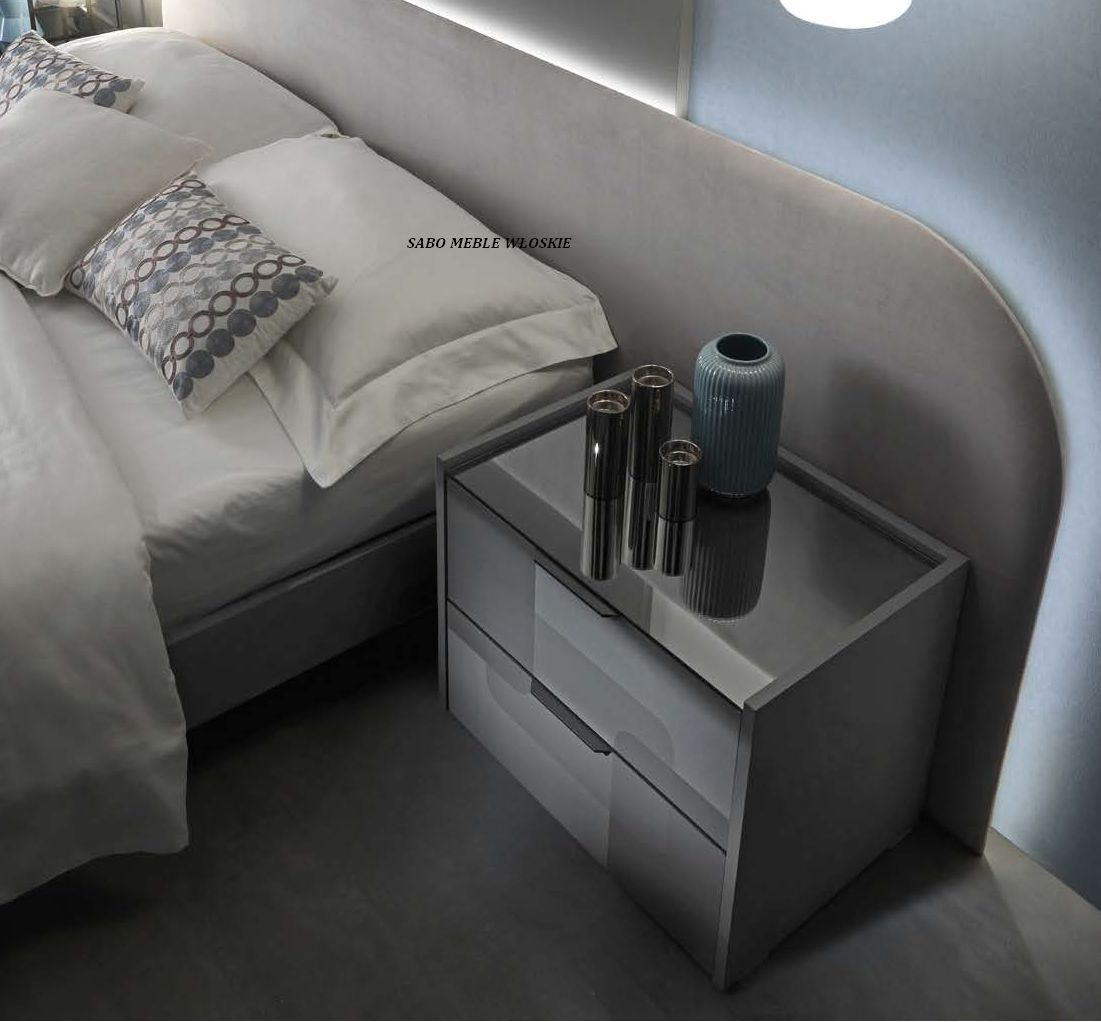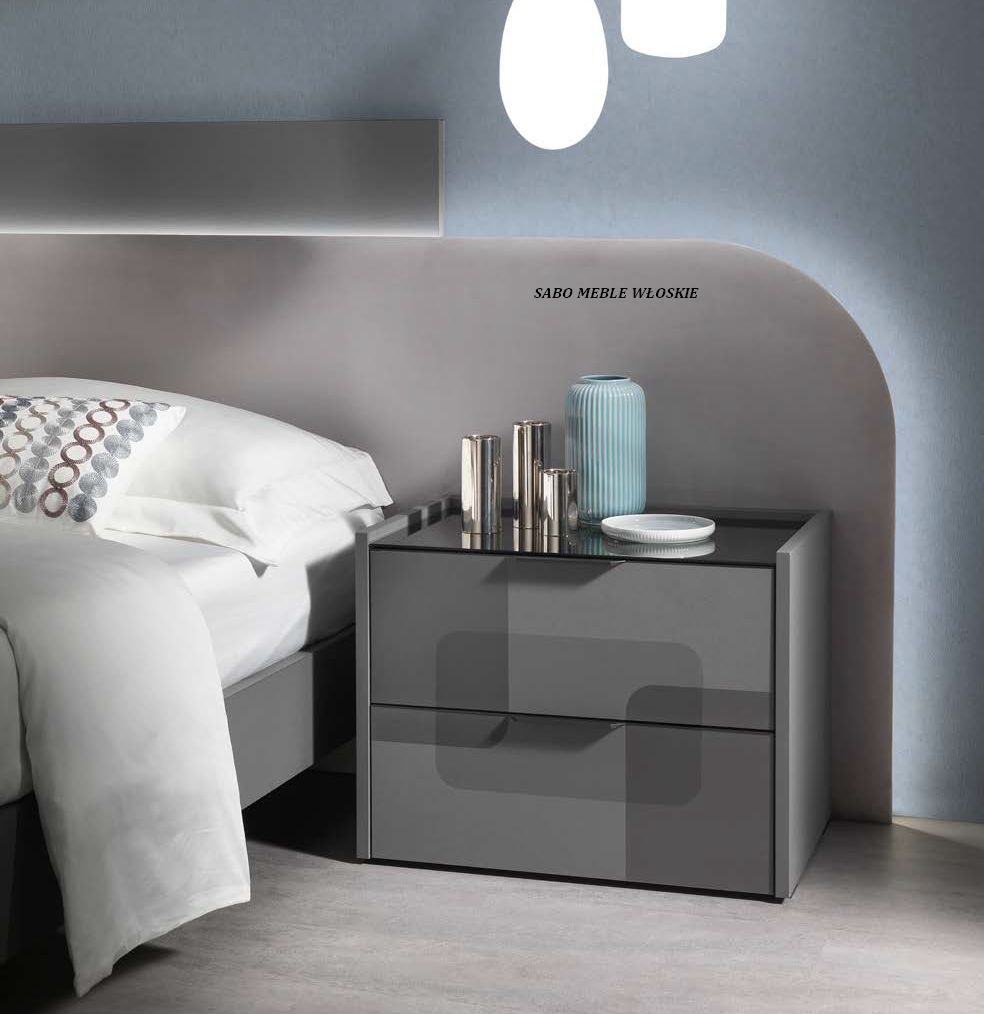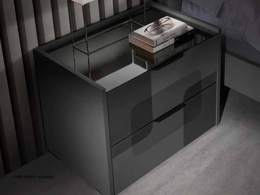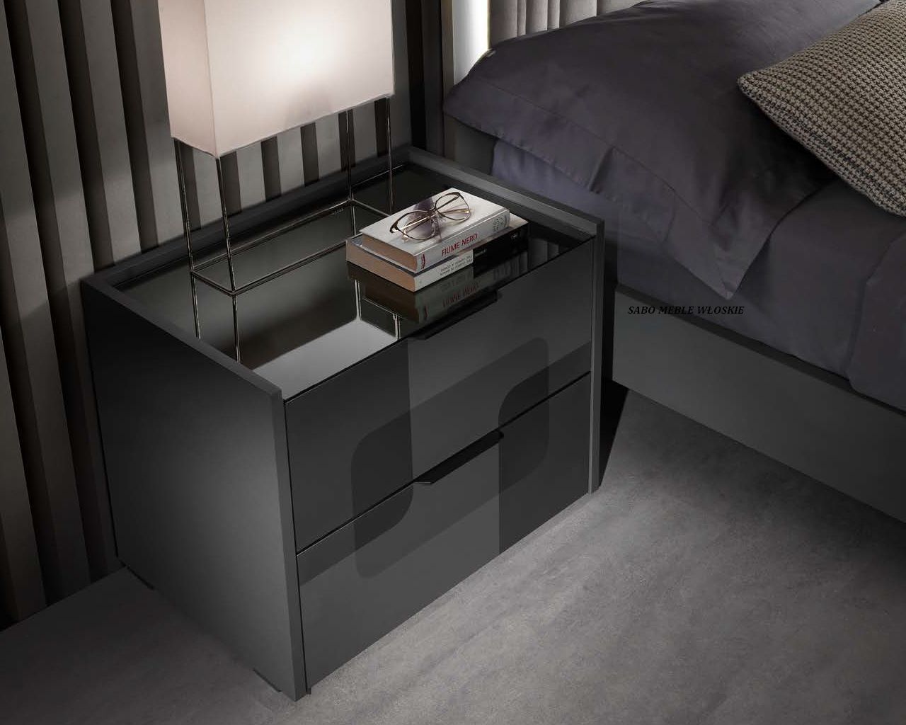 Komody i szafki nocne posiadają blat lustrzany przyciemniony a szuflady wyposażone są