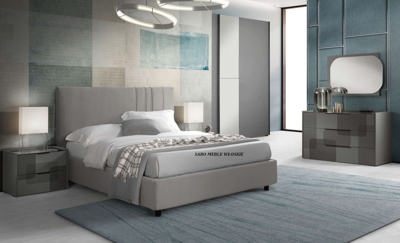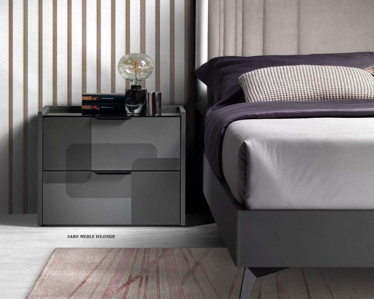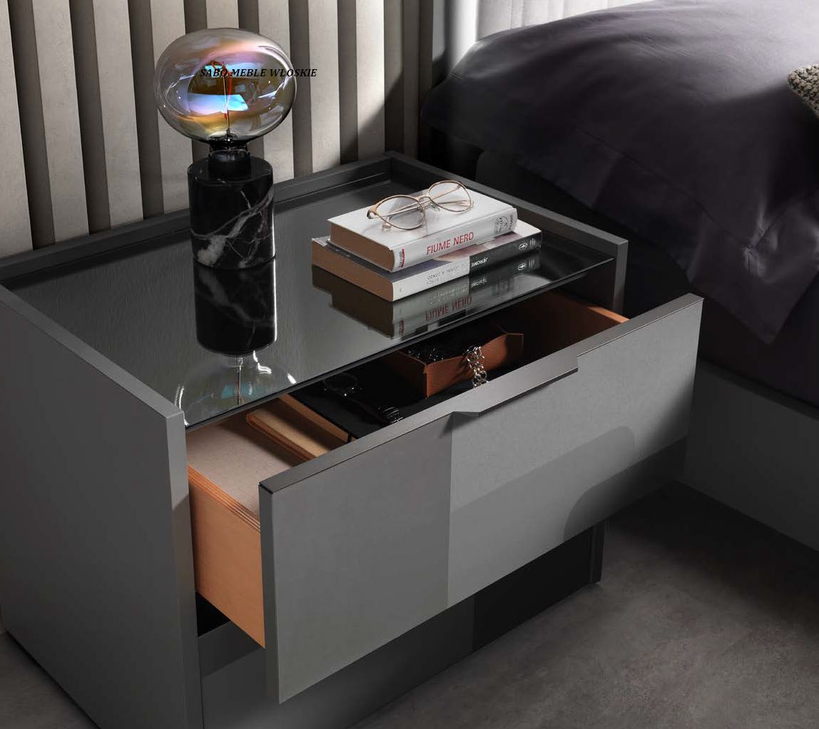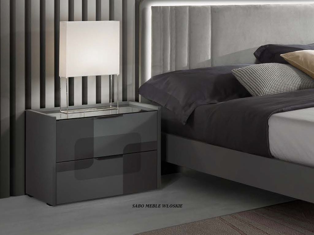 Komody i szafki nocne posiadają blat lustrzany przyciemniony a szuflady wyposażone są