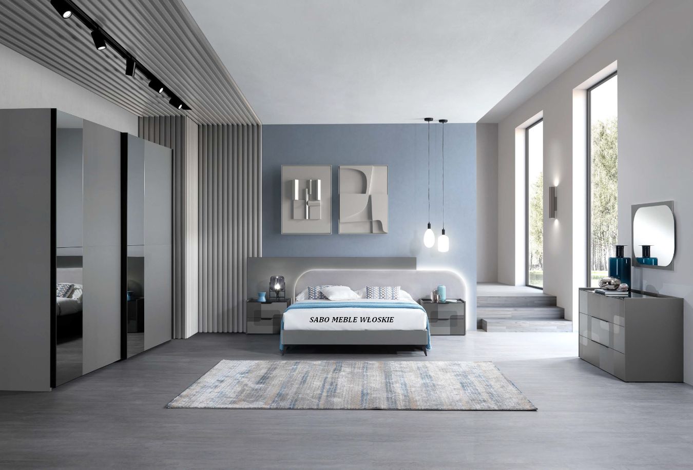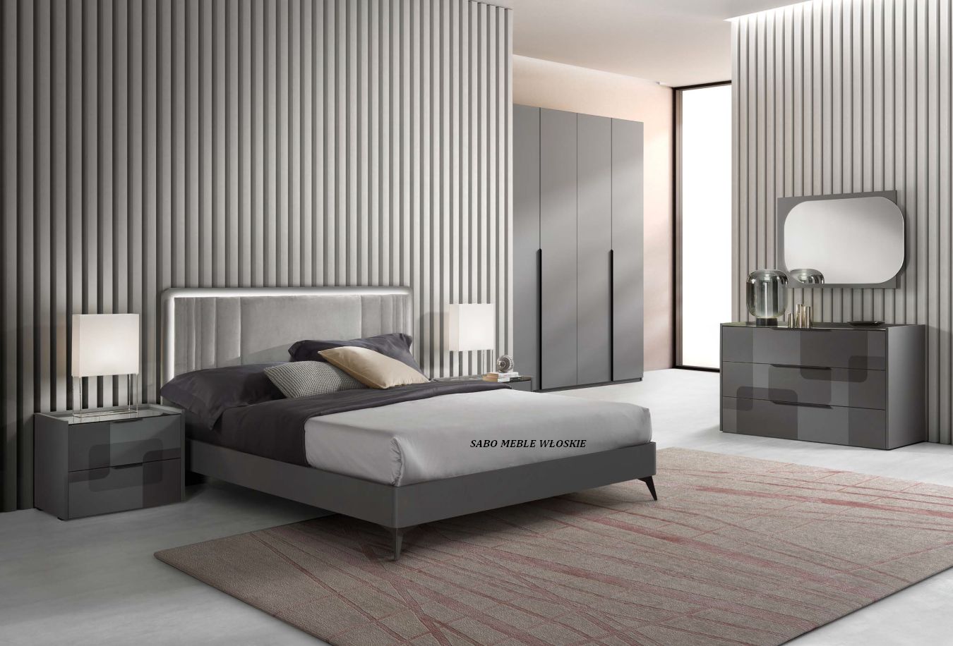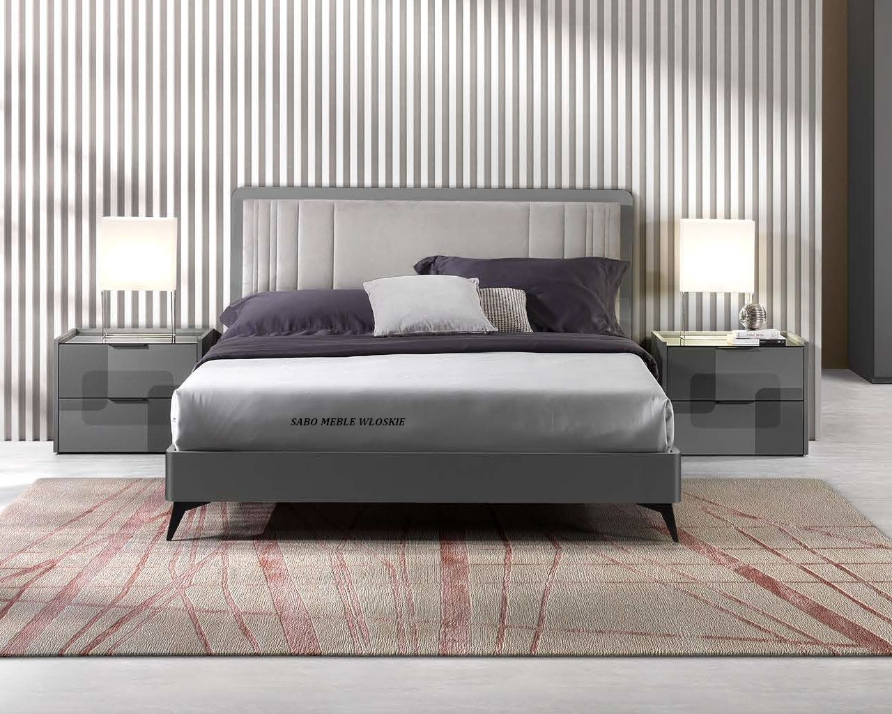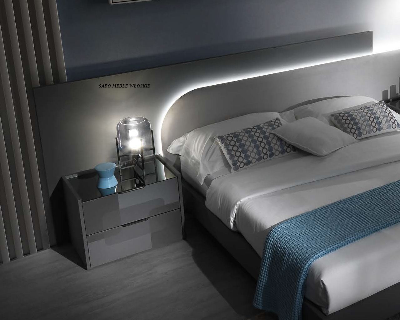 Komody i szafki nocne posiadają blat lustrzany przyciemniony a szuflady wyposażone są