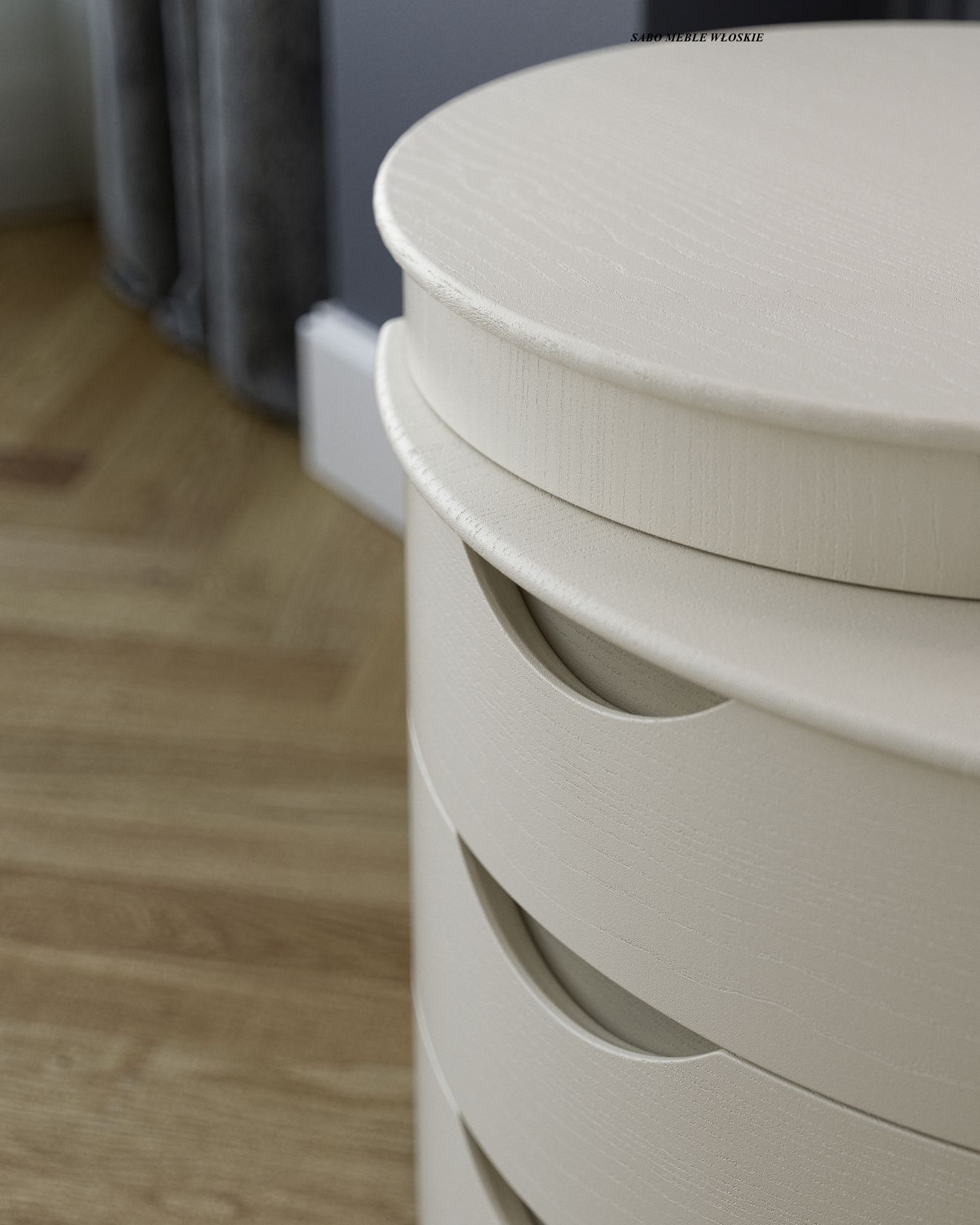 w detalach. Wykonana z drewna pokrytego fornirem jesionowym z widocznymi porami,