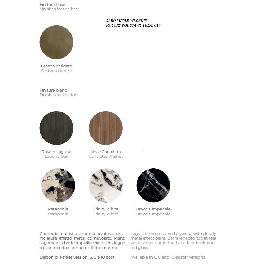 dostępny w dwóch kolorach:orzech canaletto i dąb laguna,blaty drewniane lub szklane,występuje w rozmiarach 180x100,220x100