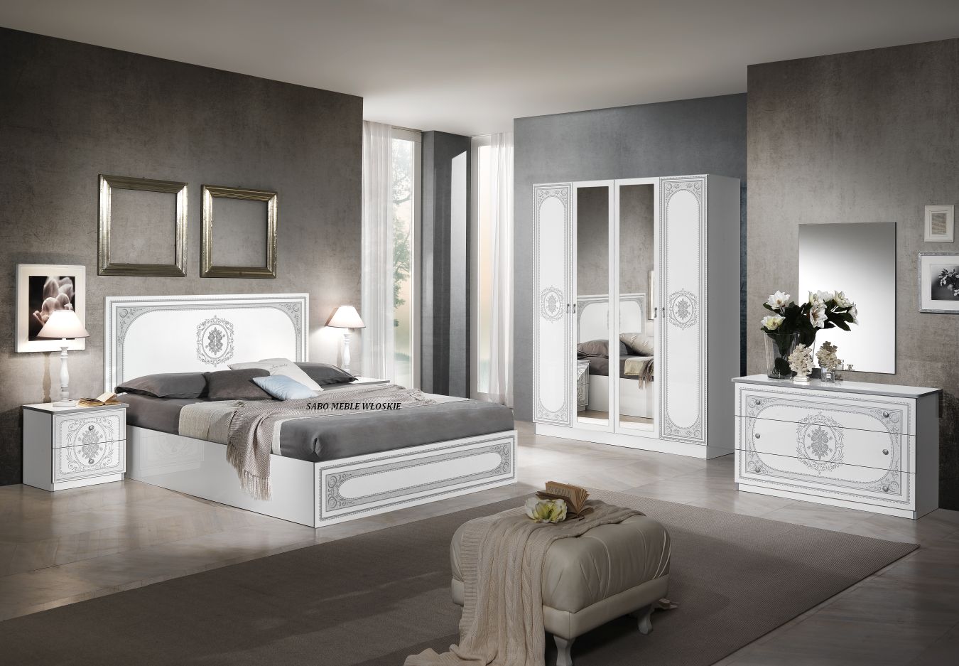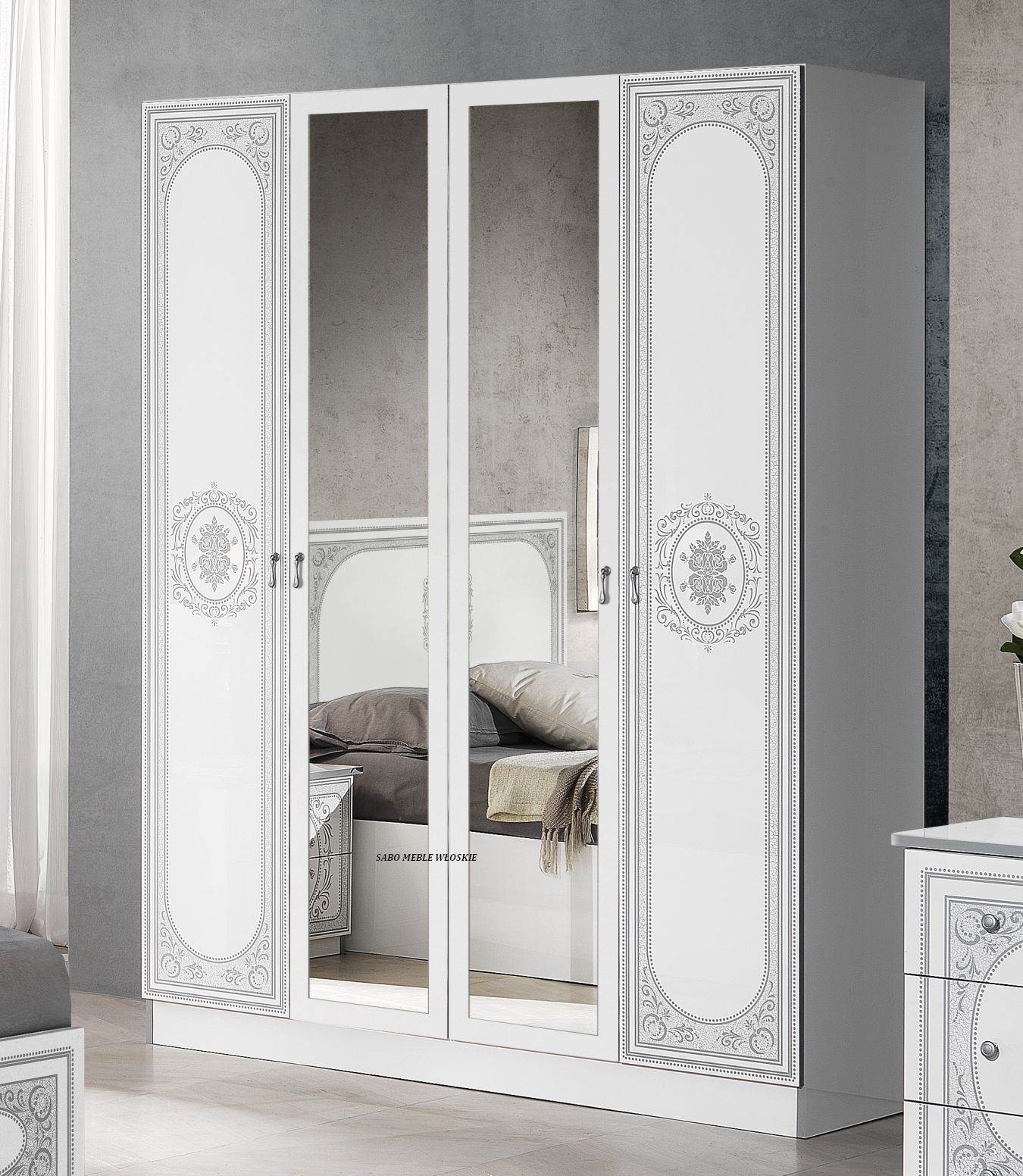 całość lakierowana na wysoki połysk w kolorze białym ,fronty ozdobione srebrną serigrafią