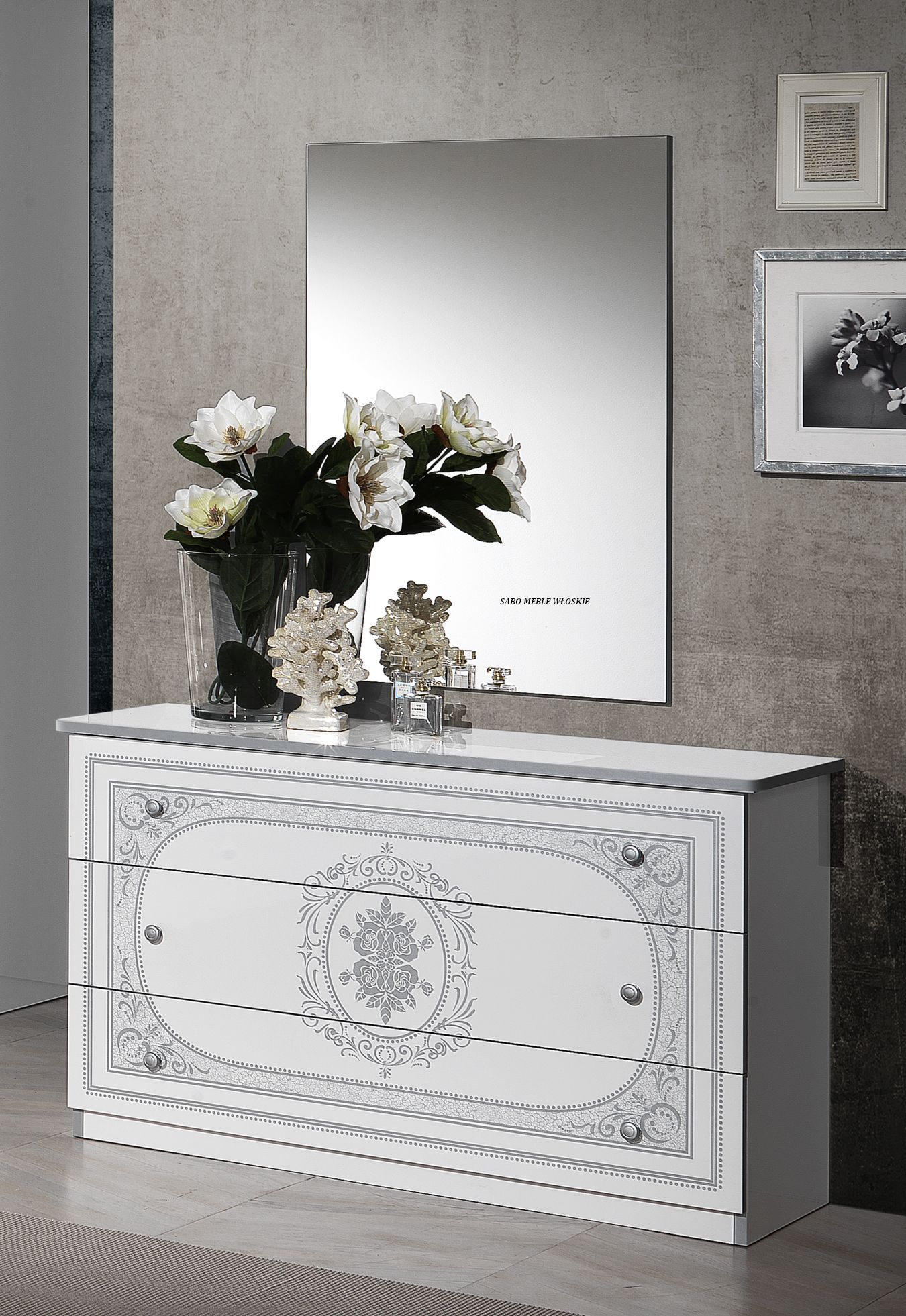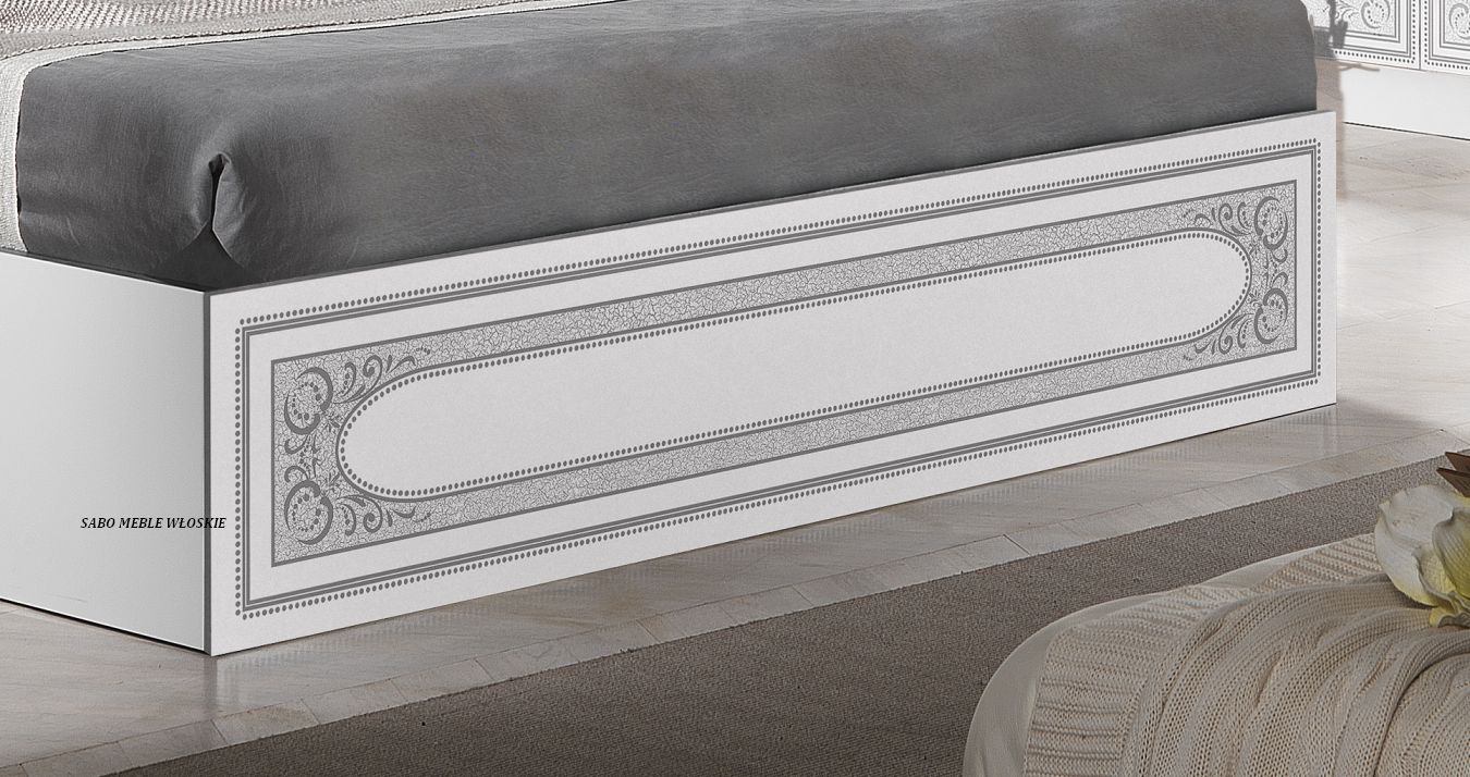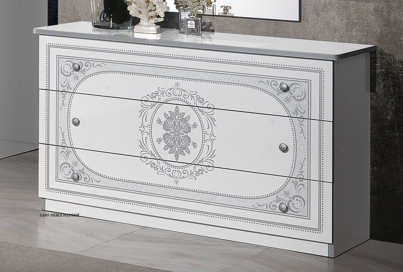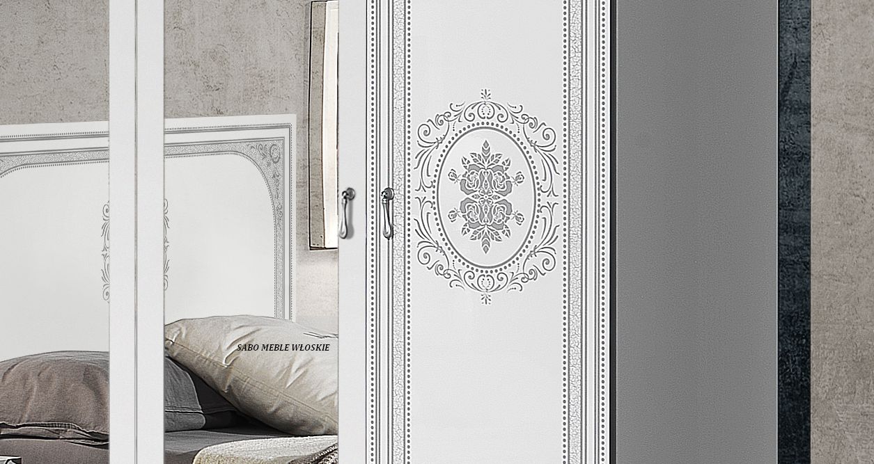 całość lakierowana na wysoki połysk w kolorze białym ,fronty ozdobione srebrną serigrafią
