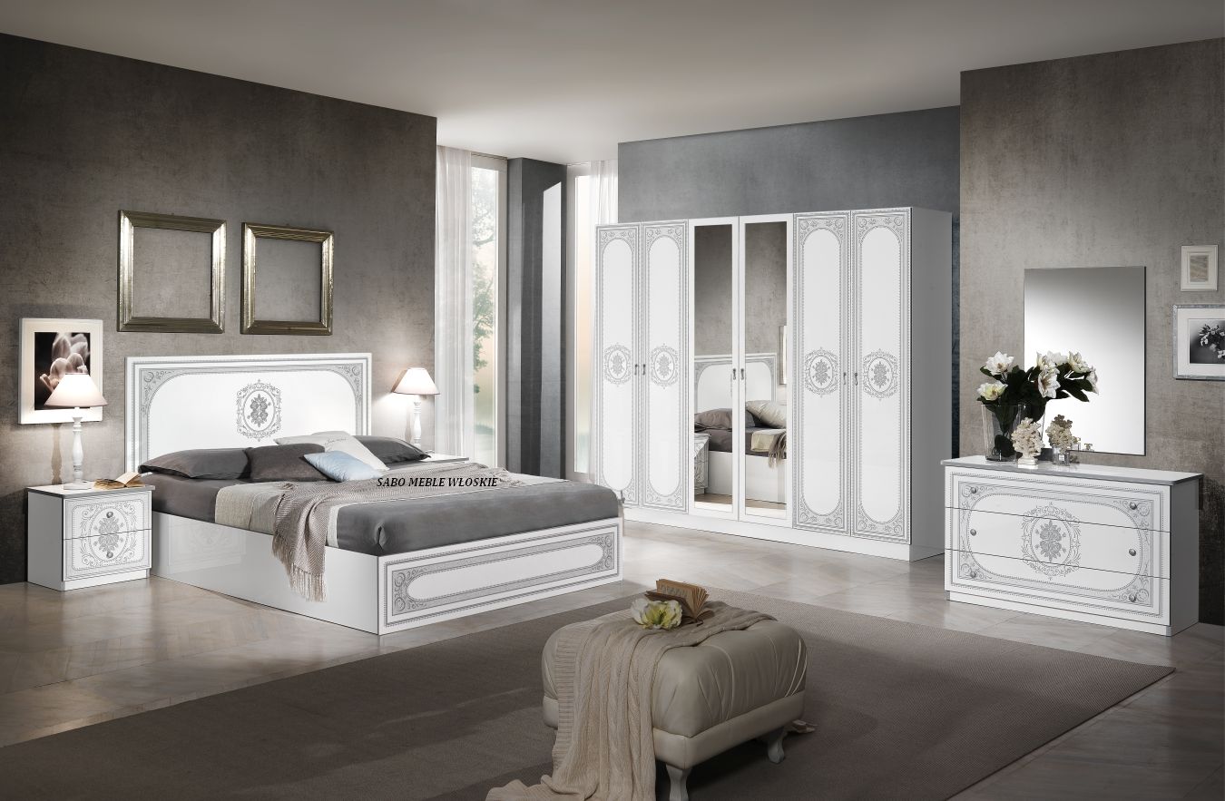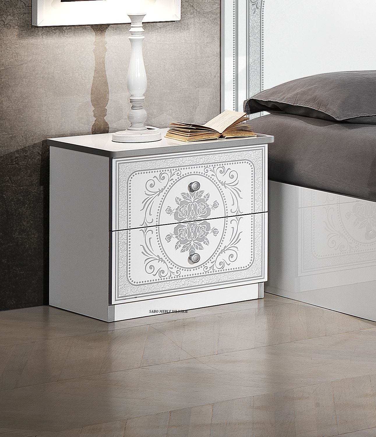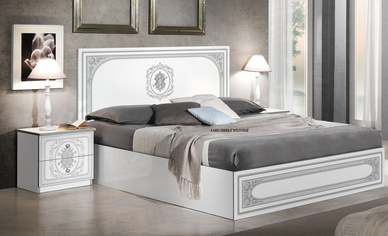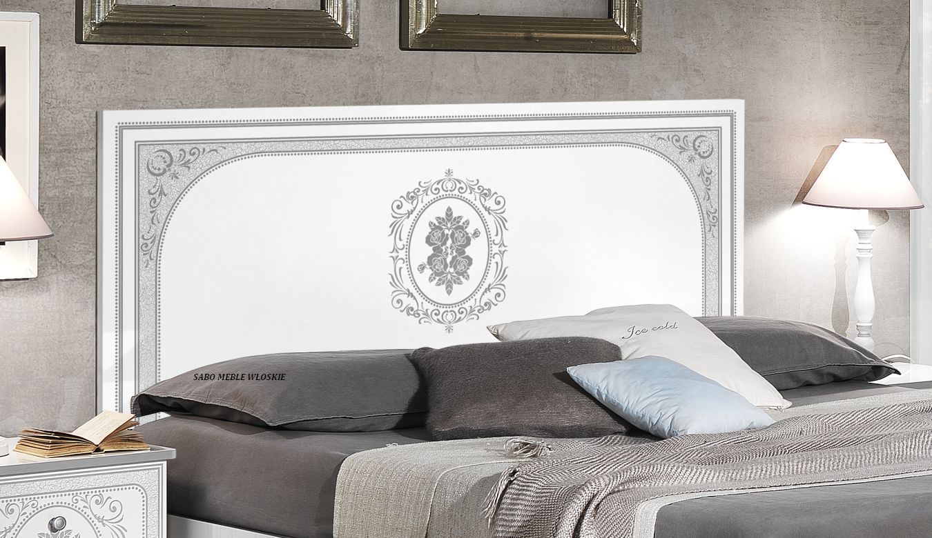 całość lakierowana na wysoki połysk w kolorze białym ,fronty ozdobione srebrną serigrafią
