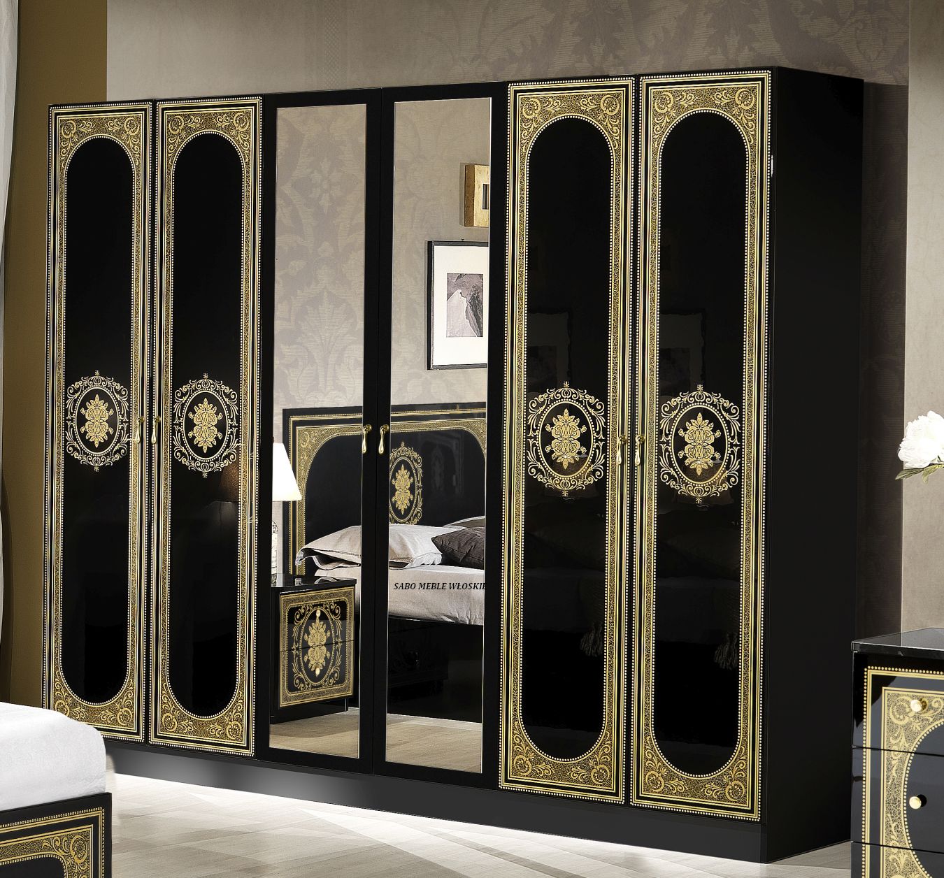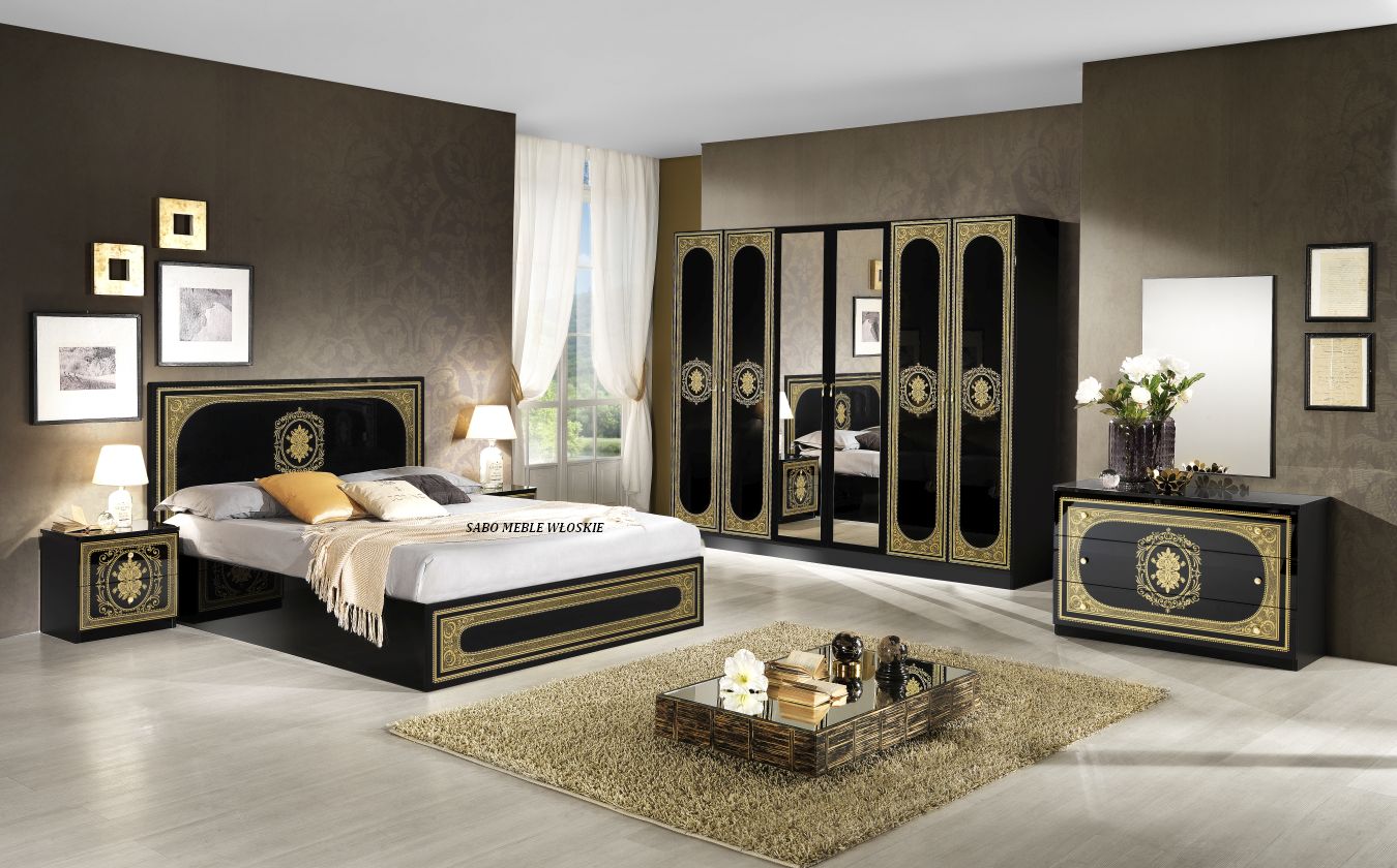 całość lakierowana na wysoki połysk w kolorze czarnym ,fronty ozdobione złotą serigrafią
