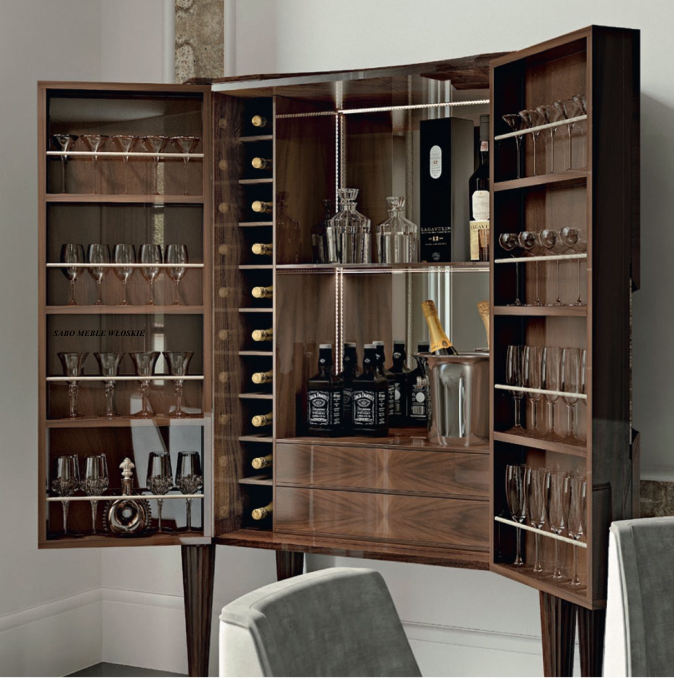 Barek Ovale w kolorze orzechowym (noce) w wysokim połysku ,konstrukcja z drewnianej płyty stolarskiej grubości 25 mm z drzewa orzechowego
