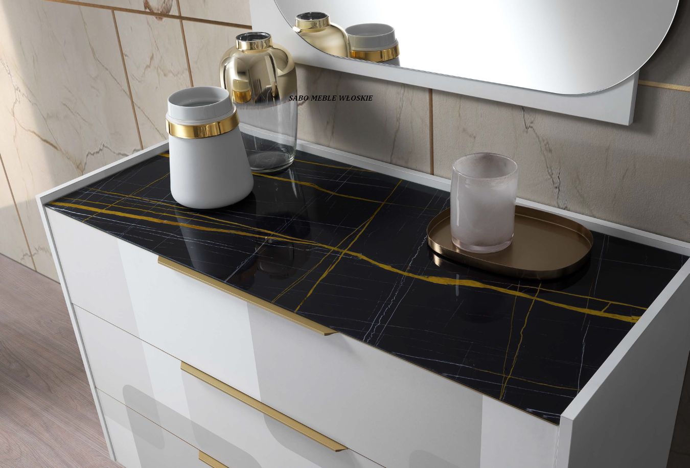 Komody i szafki nocne posiadają blat szklany czarny z efektem marmuru a szuflady