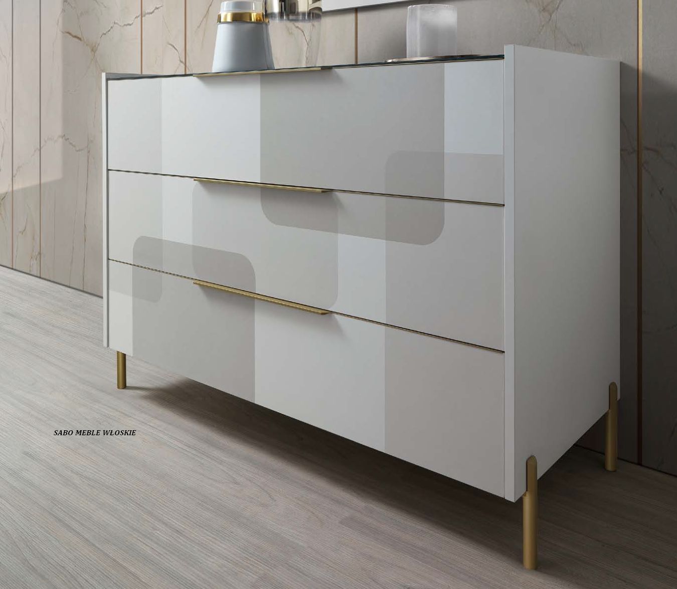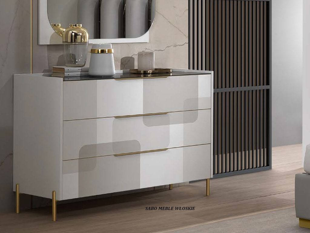 Komoda do sypialni Bella Casa Lux biel talkowa z aluminiowymi nóżkami w kolorze złotym