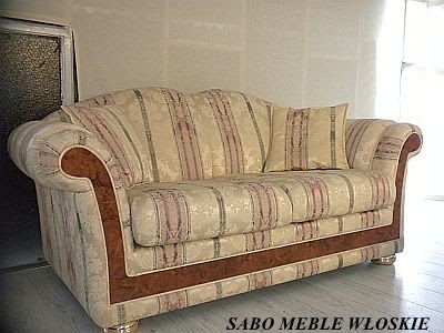 kanapa 3-osobowa Stefania tapicerowana w pasiastej tkanine ze wstawkami z drewna wrzośca