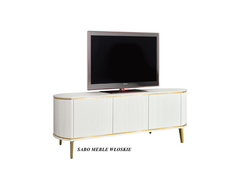 Stolik tv 3-drzwiowy Margaret na metalowych złotych nóżkach w kolorze białym,MEBLE SĄ ZAMAWIANE I PRZYWOŻONE TYLKO I WYŁĄCZNIE NA KONKRETNE ZAMÓWIENIE KLIENTA