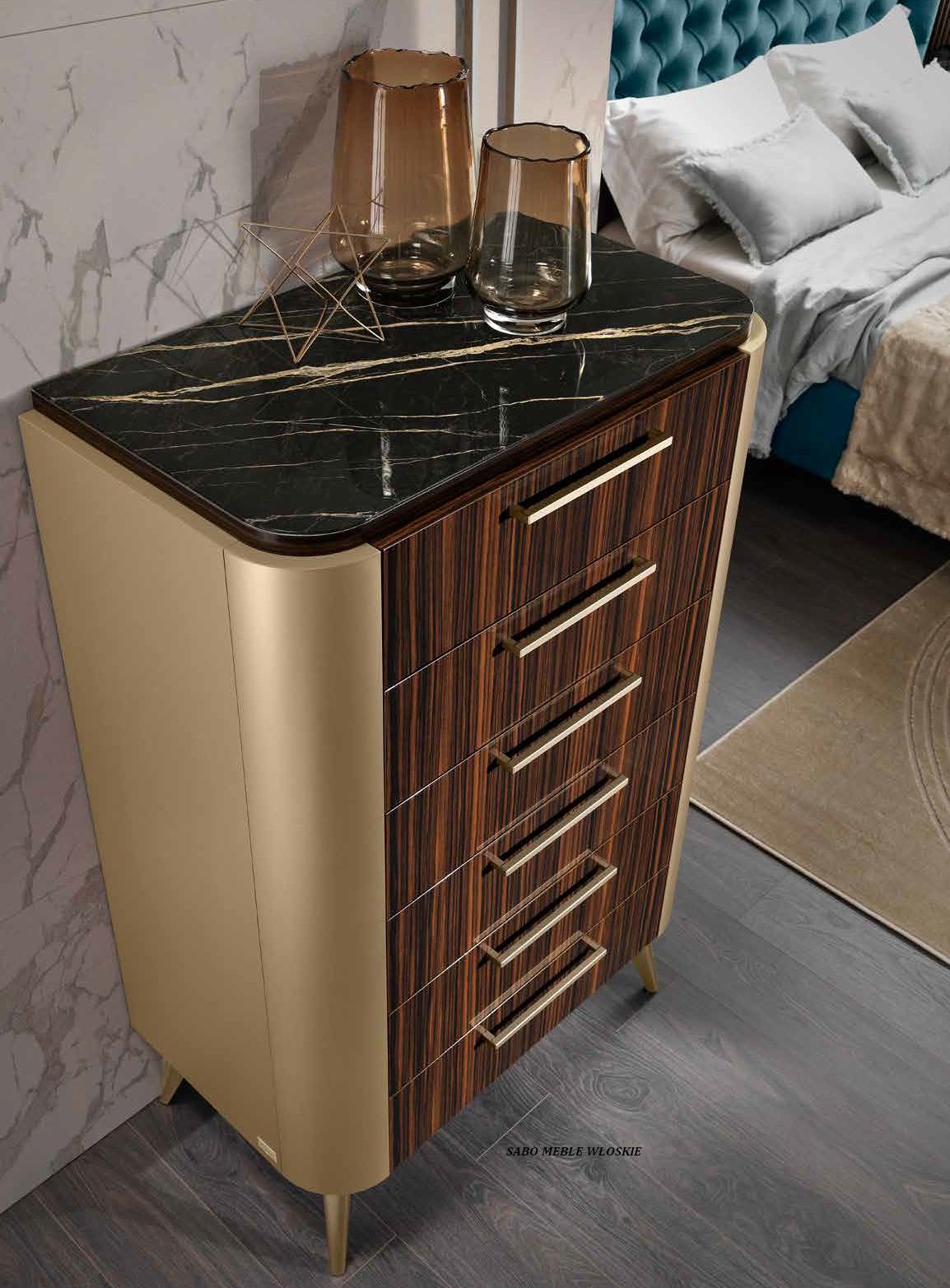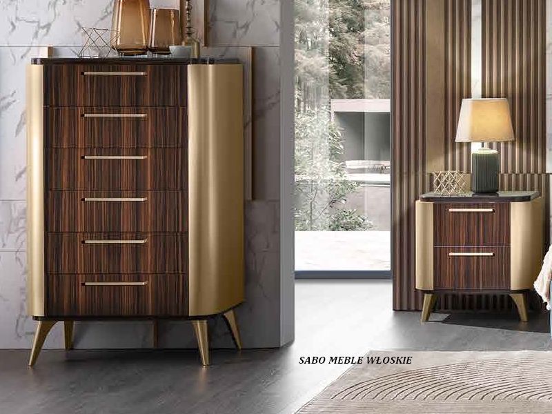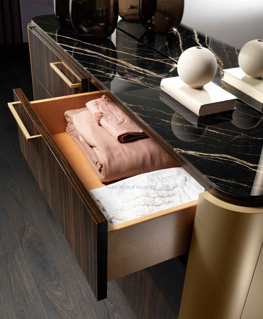 połączenie drewna hebanowego ze złotymi wstawkami i szkłem imitującym czarny marmur
