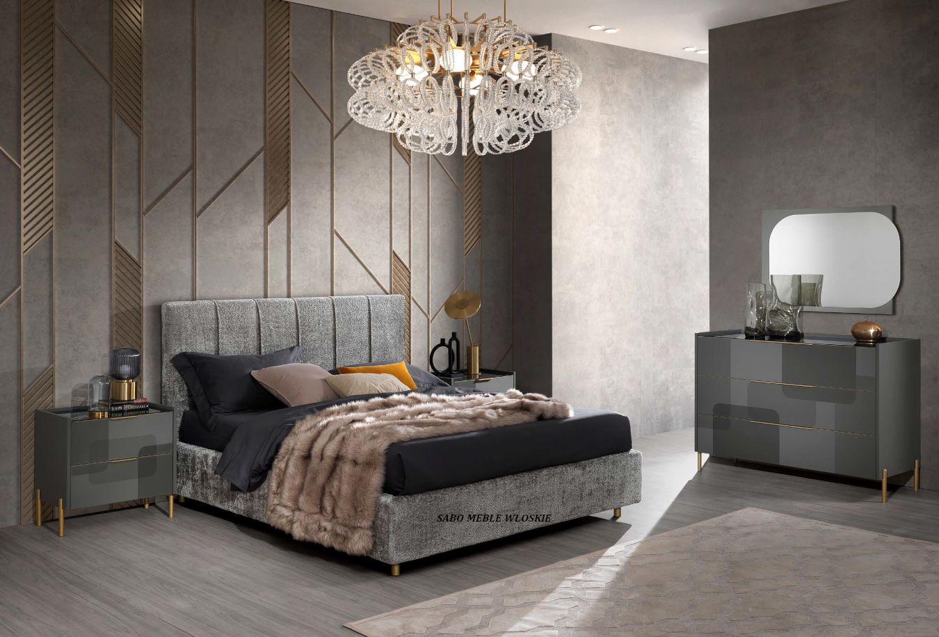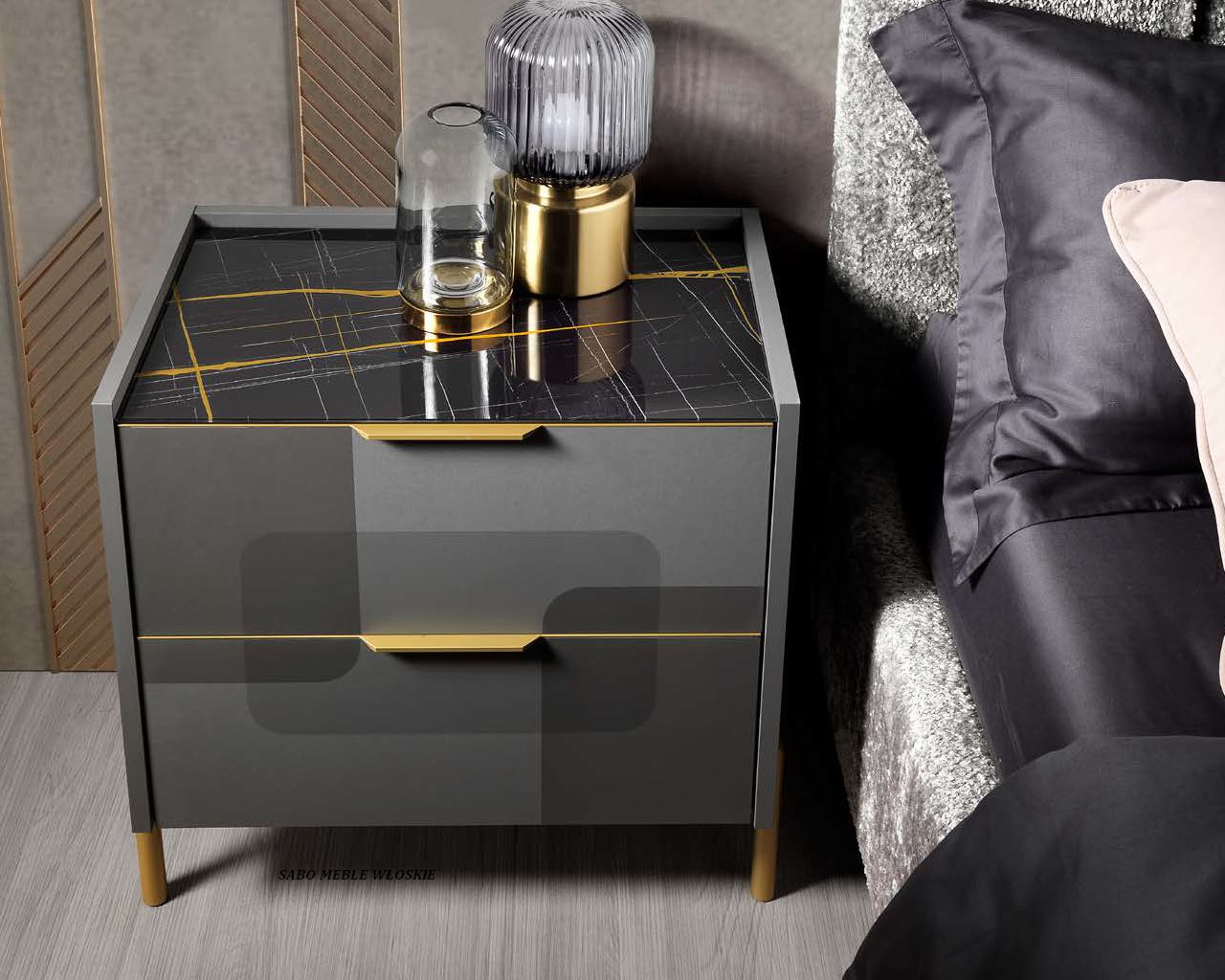 Komody i szafki nocne posiadają blat szklany czarny z efektem marmuru a szuflady