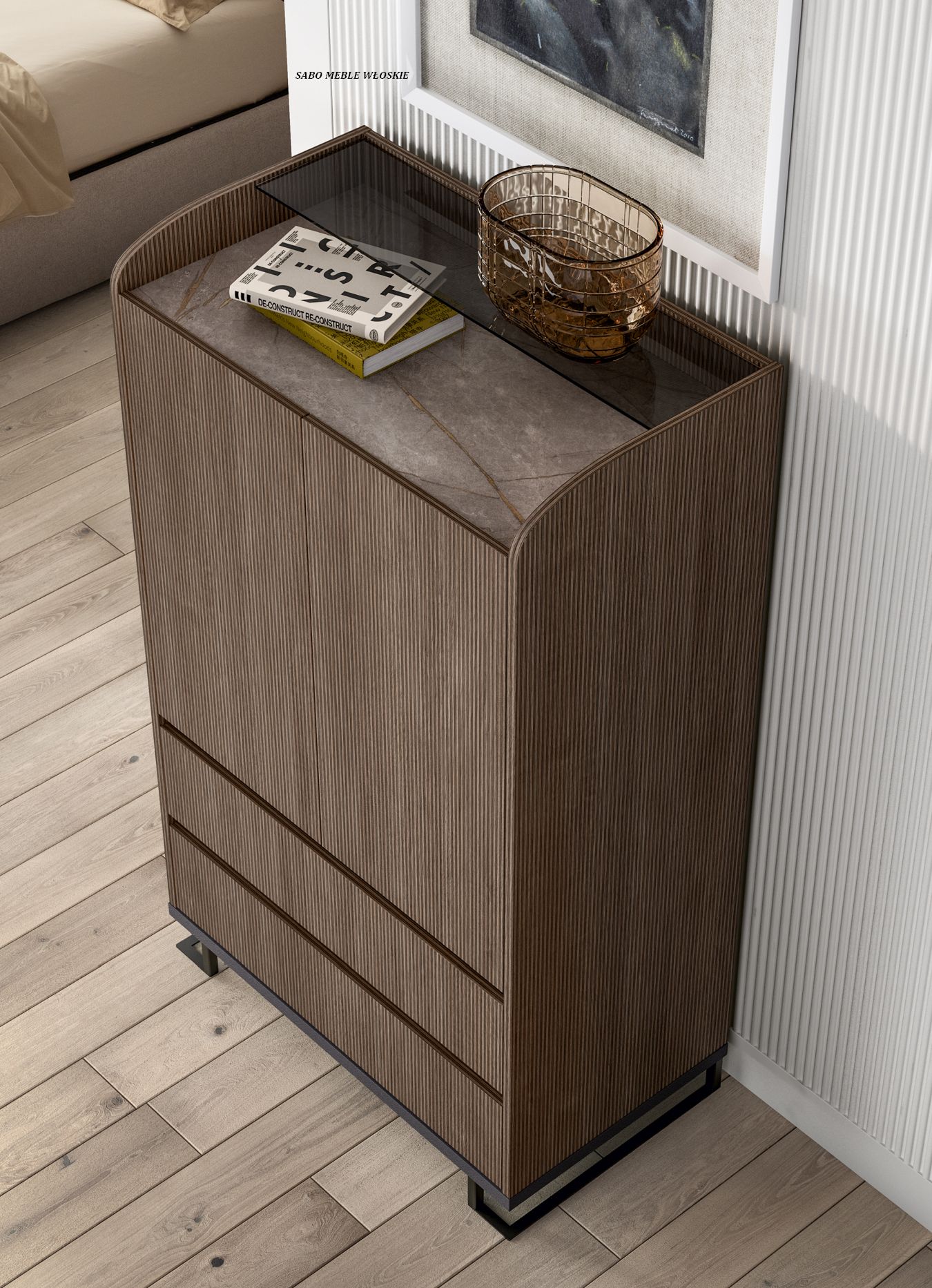 imitującej marmur.Charakterystyczny drugi szklany blat dodaje meblom głębi i lekkości.